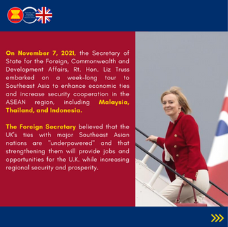 On November 7, 2021, the Secretary of State for the Foreign, Commonwealth and Development Affairs, Rt. Hon. Liz Truss embarked on a week-long tour to Southeast Asia to enhance economic ties and increase security cooperation in the ASEAN region, including Malaysia, Thailand, and Indonesia.